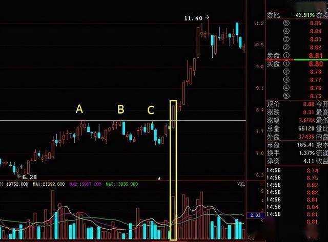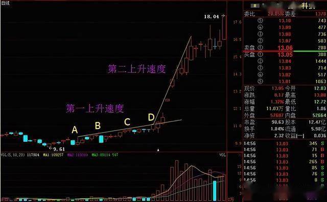 A、B、C三个高点几乎水平,意思就是第一上升速度为水平。5月8日放量拉升,成交量有前期三倍之多。这时均线向上发散,K线向上突破第一上升速度压力,进入第二上升速度。随后几天成交量持续放大,这就说明股价上涨得到成交量支持,后劲很足。