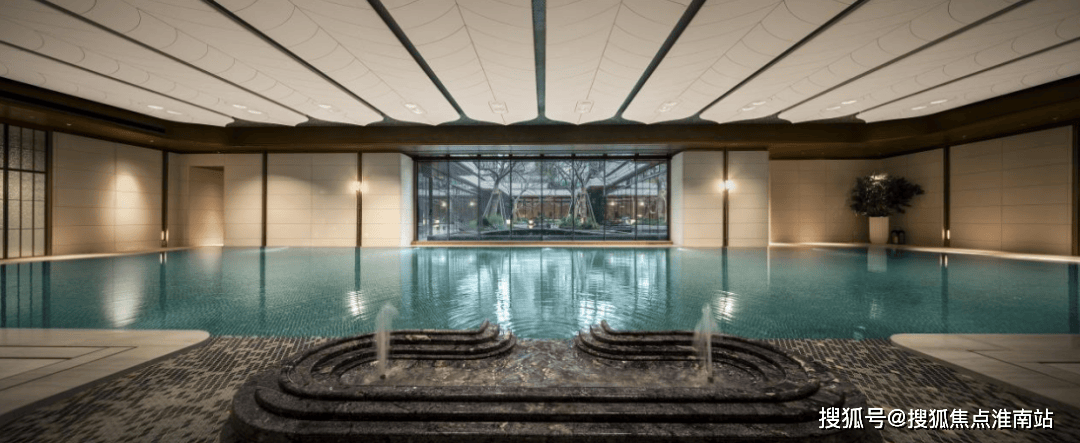 恒温泳池:第一,采用了景德镇烧制的陶瓷马赛克,独特的釉面色彩由景德镇老师傅手工浇筑而成,充满人文艺术底蕴;第二,羽毛天花造型,由600余件铝板打造,表面采用了仿贝壳纹的艺术漆处理,带来松弛度假感;第三,不仅配置了约25m×10m的4道泳池,还采用了奥运会同款空调除湿系统,彰显高档品质细节!