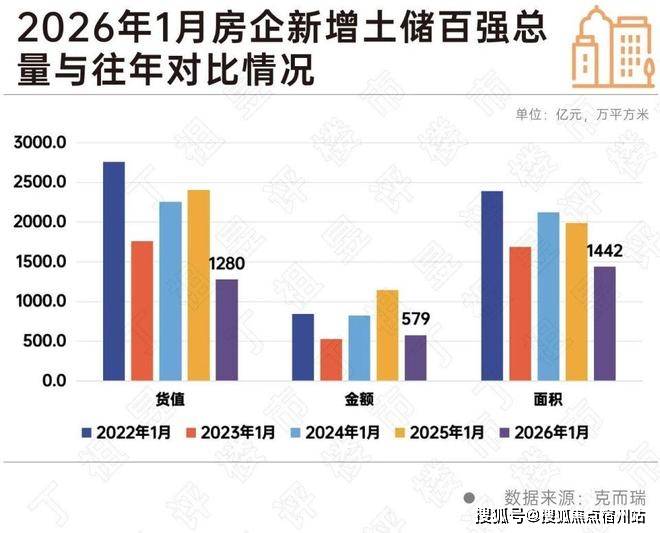 企业方面,2026年1月份,新增土储百强房企的新增货值、总价和建面百强之和分别为1280亿元、579亿元和1422万平方米,