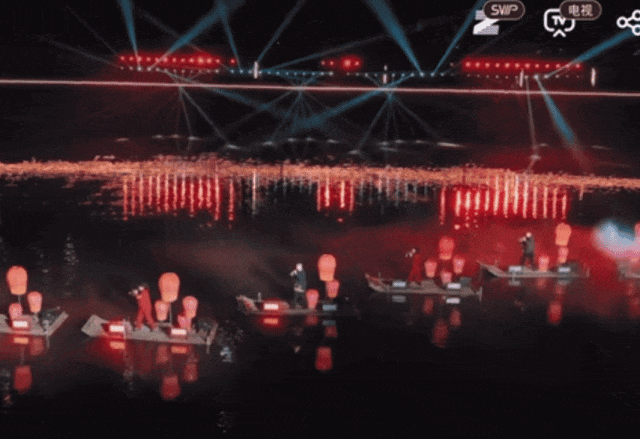 最惊艳的是特色的水上非遗唢呐表演,12位艺人站在竹筏上合奏,高亢的唢呐声伴着水景灯光,古韵十足。