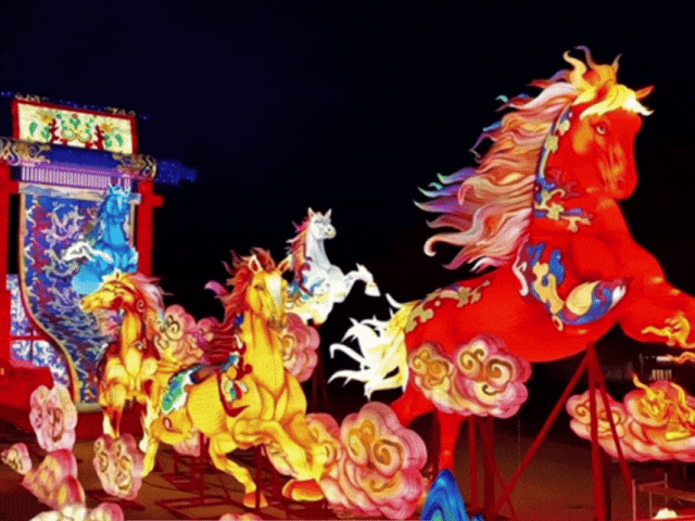 40多组彩灯里重点打卡12米高的《神骏出东方》,其设计基于“马年祥瑞·五星出东方·川蜀锦绣”三大文化符号。神骏昂首腾跃,配合动态光影与机械传动,仿佛从千年的历史长河中踏浪而来。