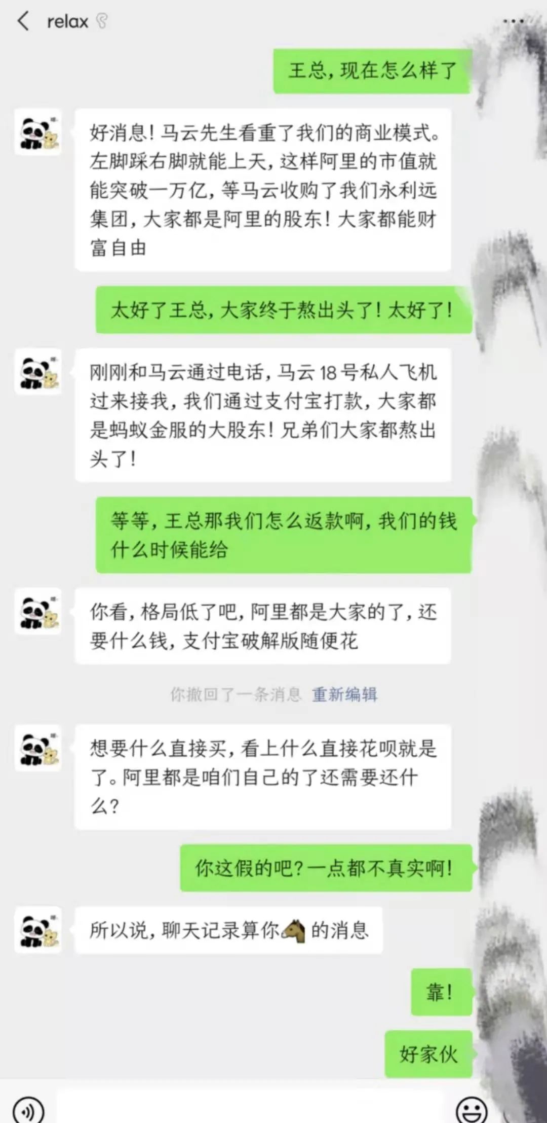 李女士说,在与部门老大面试过程中,也只是问了一些简单的问题,如询问年级有多大,之前做了什么之类的问题,最后该部门老大也是告知李女士,他们员工工资一个月都是几万几十万,听着这些“现实案例”,李女士更是吃了一个定心丸。