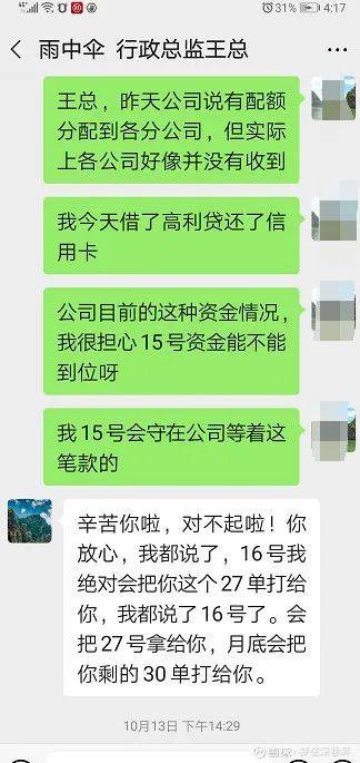 据相关人士透露:“今年9月18号开始佣金兑付出现异常,由开始的晚一天兑付到现在一直迟迟未能兑付,在目前为止已经有一个多月未能兑付佣金了,撤单也不能撤,子公司先前称账户转账限额暂时无法兑付,然后又说账户被封为由未能兑付。”