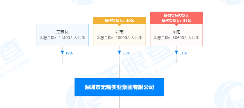 据天眼查APP显示,深圳市无糖实业集团有限公司成立于2020年5月12日,注册资本为60000万,李阳担任法人、执行董事,总经理,持股51%,刘雨持股30%,王罗林持股19%。
